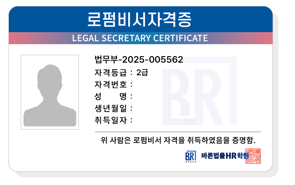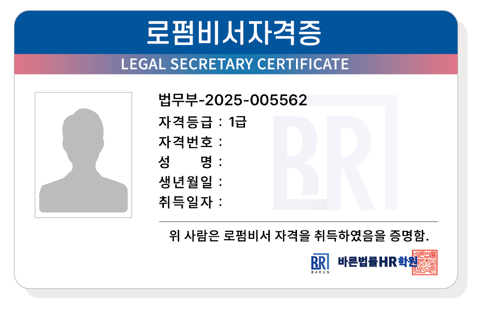 | 자격명 | 로펌비서 (Legal secretary) | 자격 발급기관 | (주)바른법률에이치알학원 |