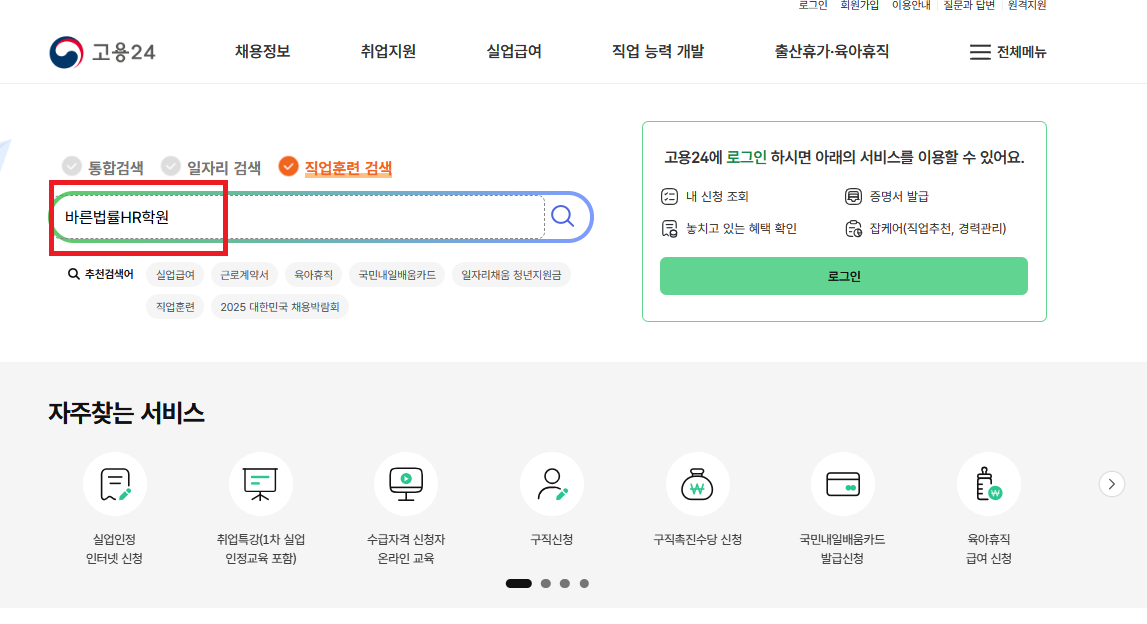 https://www.work24.go.kr 홈페이지 접속(로그인)하여 바른법률HR학원을 검색합니다.