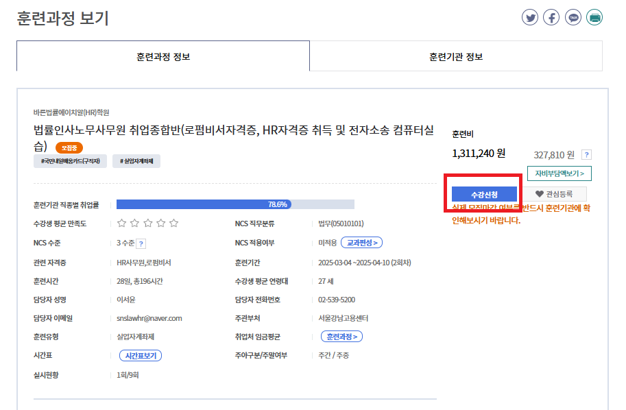 훈련과정정보를 확인하고 수강신청 버튼을 클릭합니다.