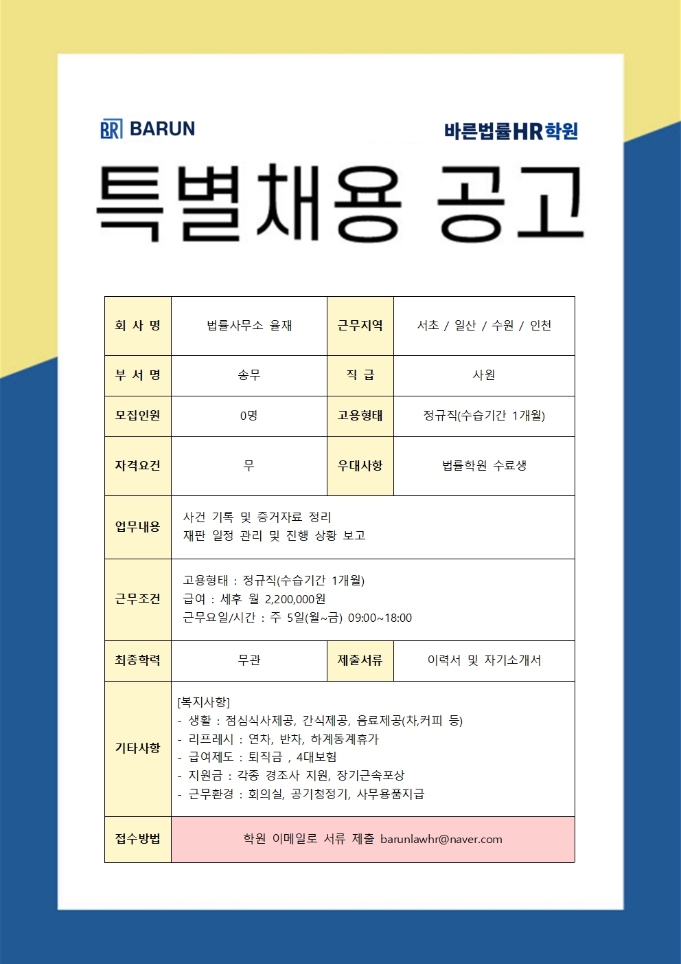 [바른법률HR학원 특채] 법무법인 율재 페이지 정보 작성자 바른법률HR학원 댓글 0건 조회 457회 작성일 25-12-11 10:42 목록 본문 이전글(국내 20대 대형로펌) 법무법인(유) 현 비서팀 송무비서 채용 (~12/14) 25.12.11 다음글[바른법률HR학원 특채] 법무법인 로고스 (국내 20대 대형로펌) 25.12.04 댓글 0 댓글목록 등록된 댓글이 없습니다.